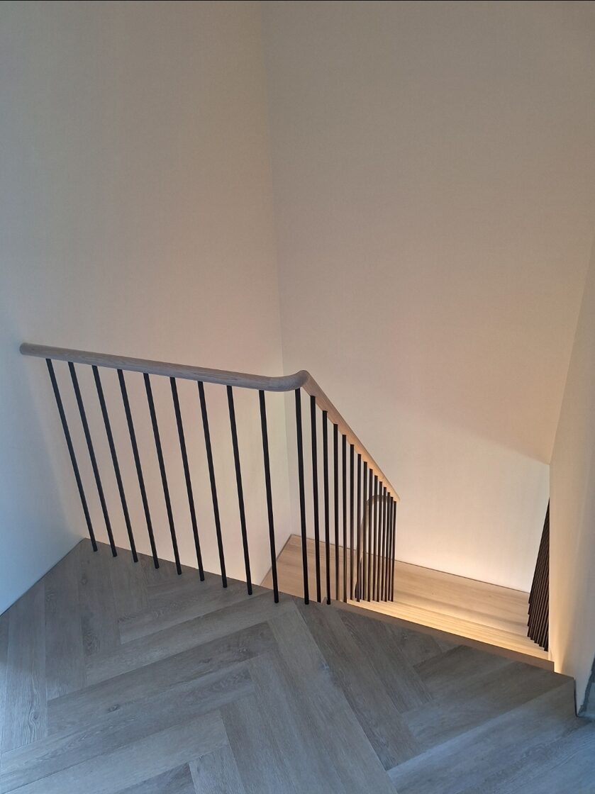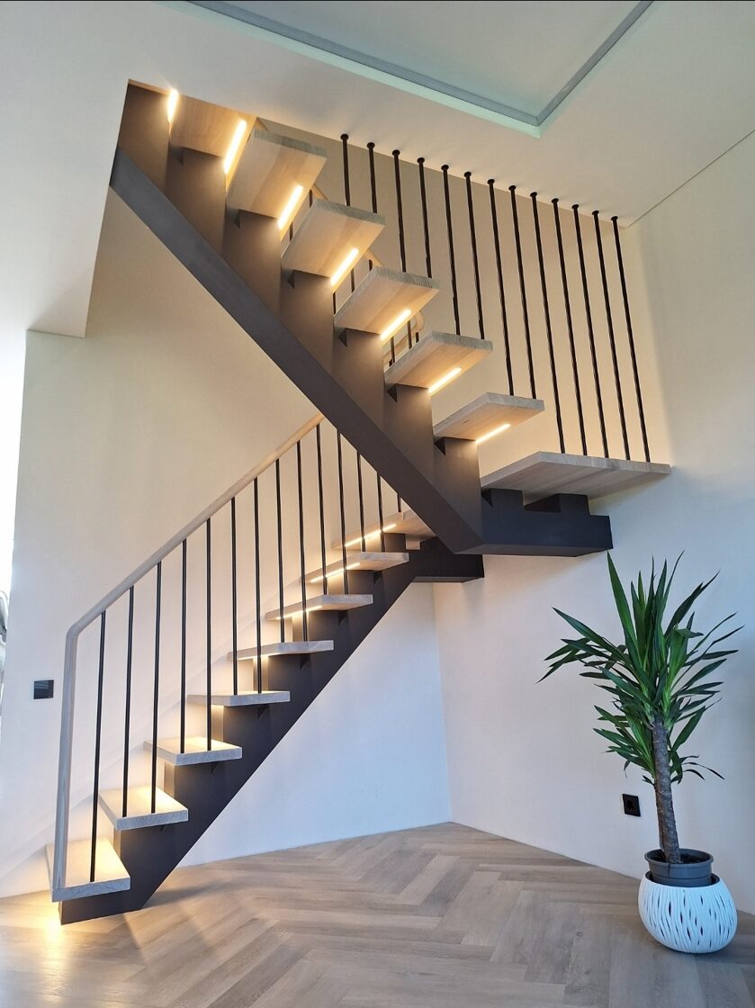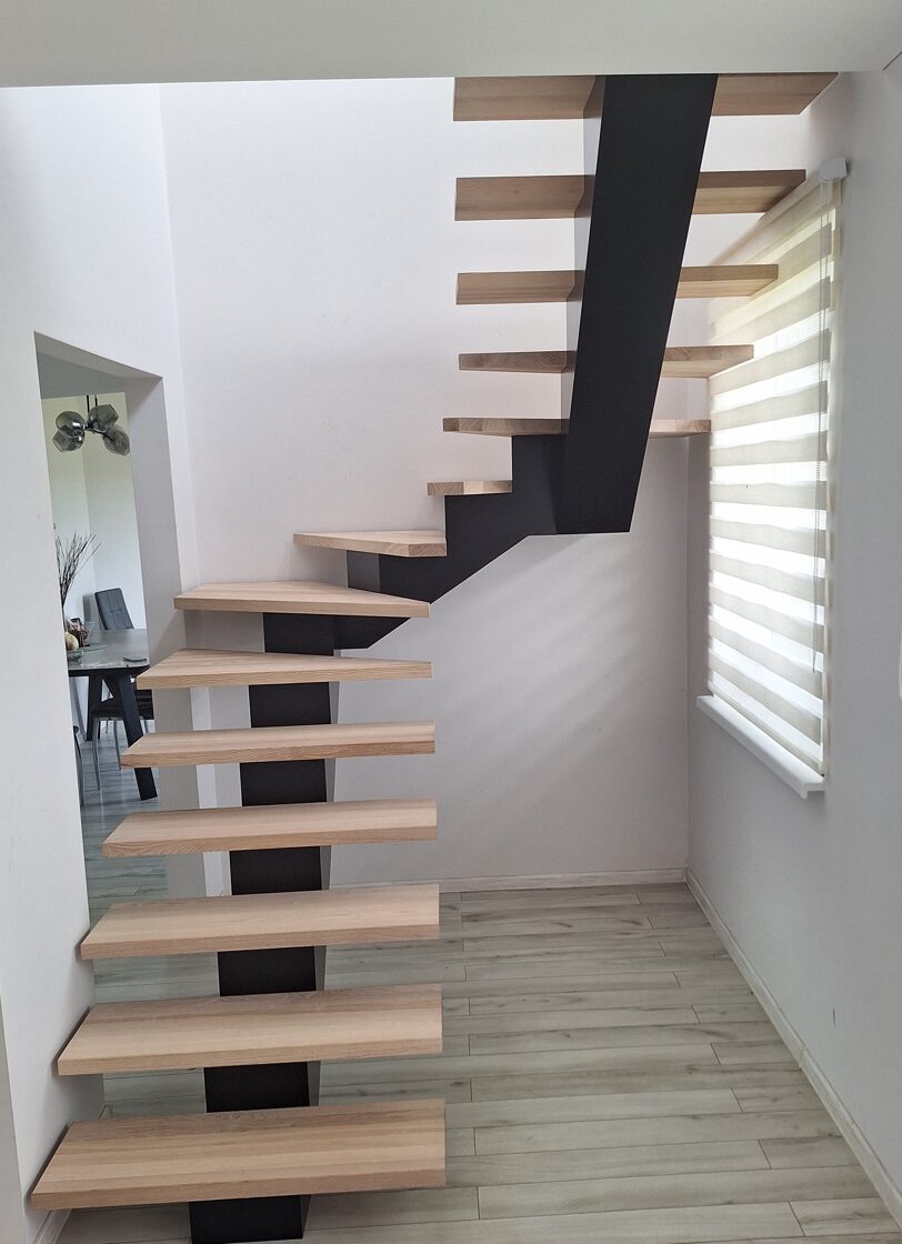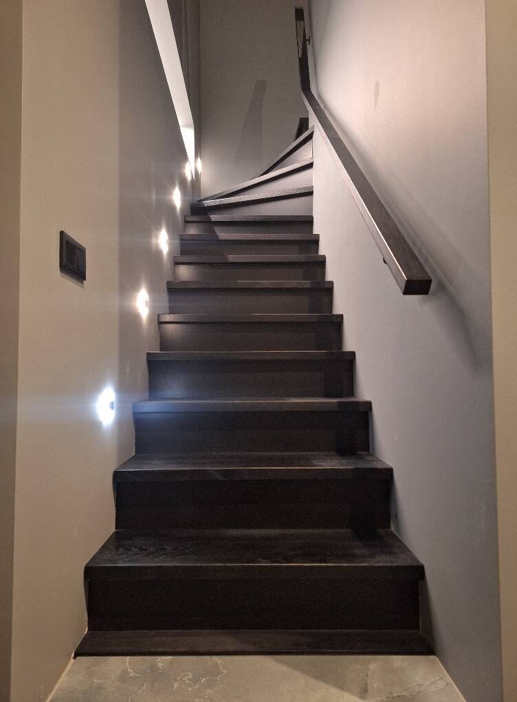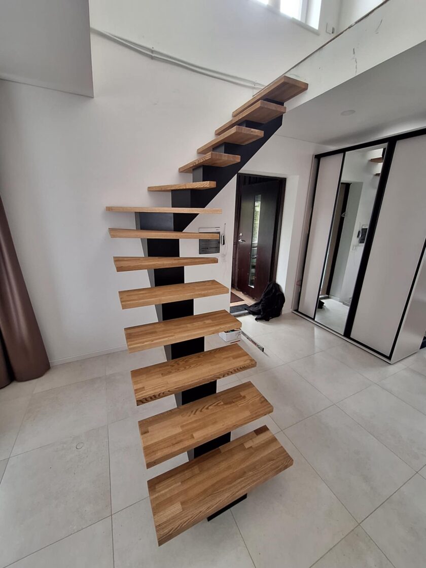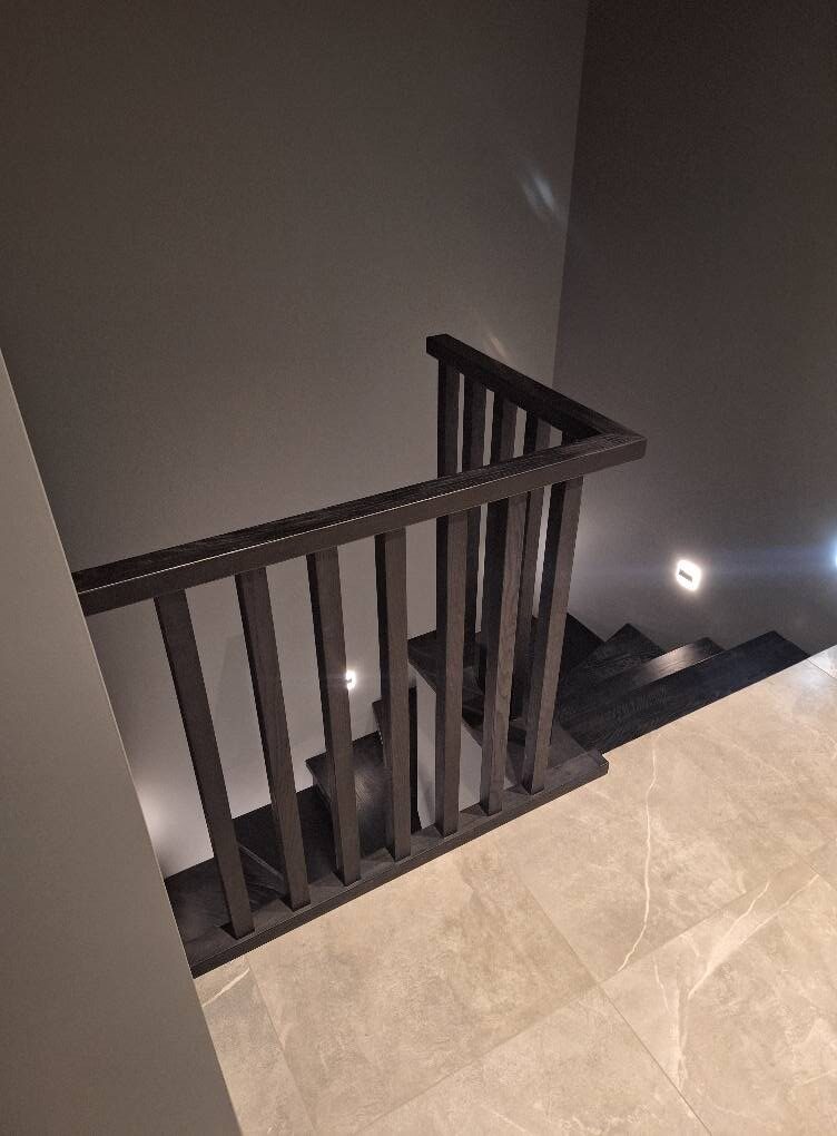 Juodu beicuotos uosio pakopos, juodos MDF priešpakopės ir uosio porankis -