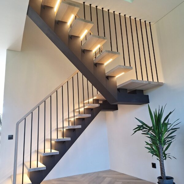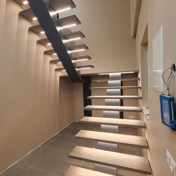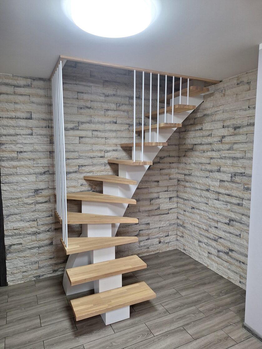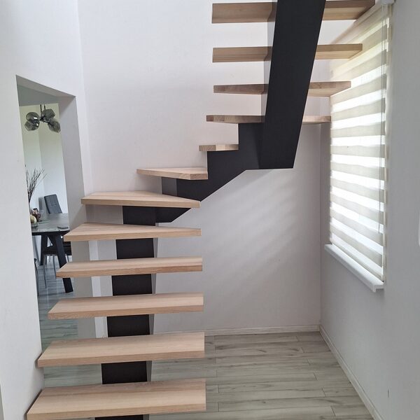 L formos plieninė laiptąsija ir uosio medienos dygiuotos pakopos -