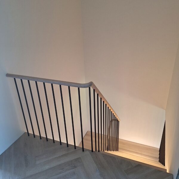 Tiesi laiptąsija kampuotu dugnu su uosio masyvo pakopomis ir kombinuotu turėklu -